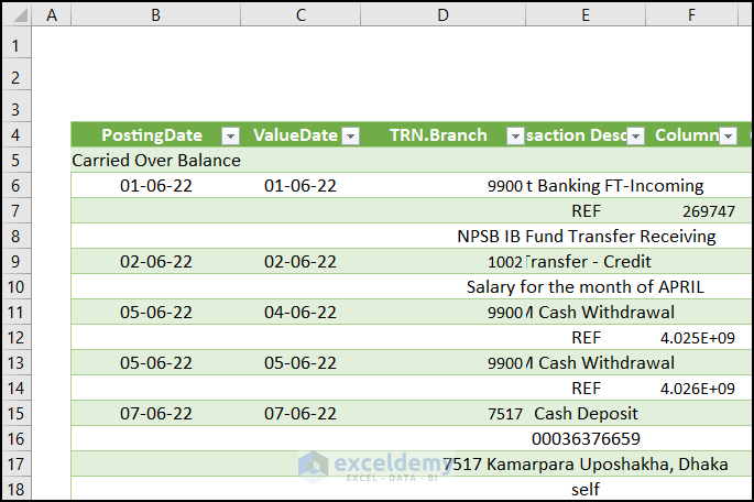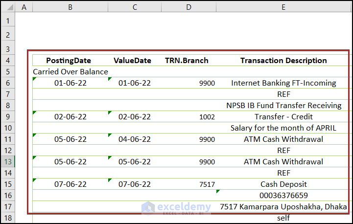- The data should look as shown in the below image. You can edit the bank statement in Excel.