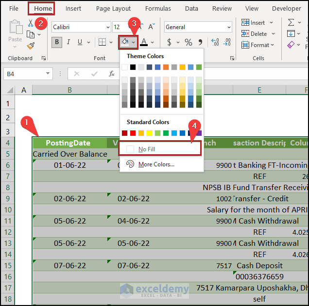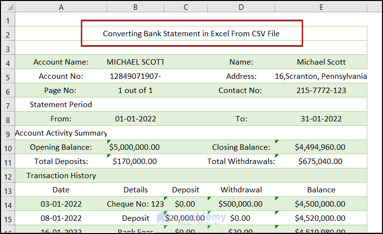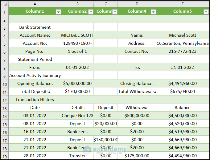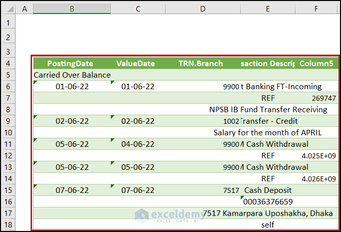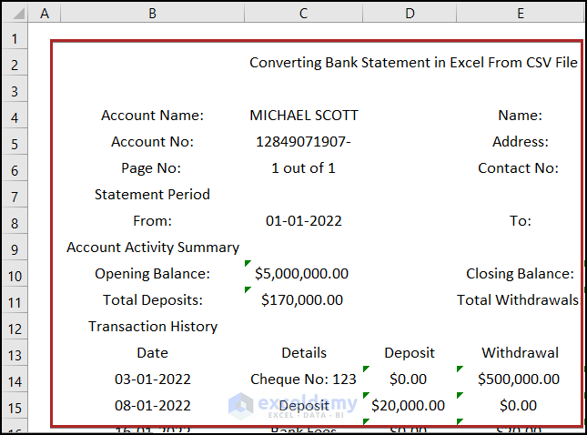 - Apply formatting like borders and filling cells with colors. Our bank statement gets the right outlook to be an Excel sheet.