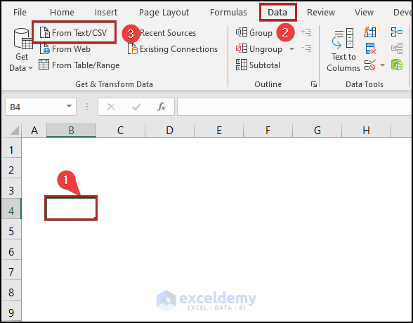 - We selected cell B4, but the imported data occupies the sheet from the top left portion.