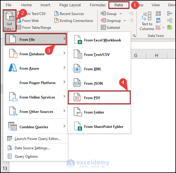 - Click on the Get Data drop-down on the Get & Transform Data group.