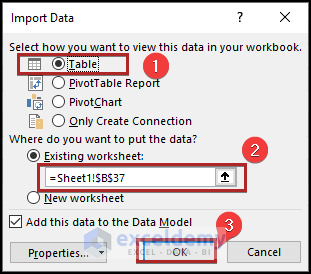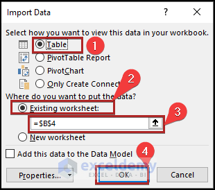 - Select Existing worksheet and B4 cell as the output destination in the Where do you want to put the data? option.